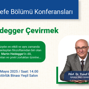 Prof. Dr. Yusuf Örnek'in "Heidegger Çevirmek" başlıklı konuşmasının gerçekleşeceği Felsefe Bölümü konferans etkinliğine ilişkin bilgileri aşağıda bulabilirsiniz.